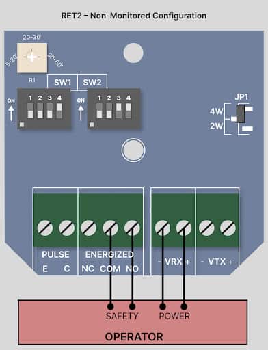 The RET2 is a versatile access control solution because it can be used for both monitored and non-monitored applications. It’s UL325 compliant and seamlessly integrates with a wide array of monitored and non-monitored legacy products. This versatility enables you to enjoy more value from a single solution and ensures that if your needs change, you have a high-quality photoeye ready to adapt. Below, review the seamless two-step wiring process to make the RET2 non-monitored.