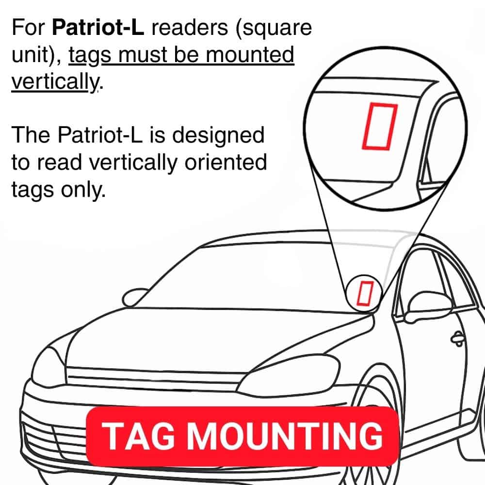 Patriot-L readers (square unit), tags must be mounted vertically. The Patriot-L is designed to read vertically oriented tags only.