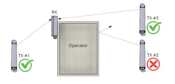 In the diagram, TX #1 and TX #3 have LINE OF SIGHT to the RX. TX #2 does not have LINE OF SIGHT to the RX because the operator will block the wireless signal. TX #2 may suffer from a poor connection and poor battery life.