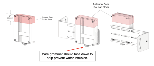BEST PRACTICE: When mounting TX and RX unit, mount with wire grommet facing down to prevent water intrusion.