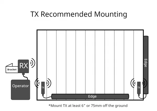 Mount each TX near its sensing edge: First, wire the sensing edge into the TX’s terminal blocks. There is no polarity on this wiring. Next, use two #8 machine screws to secure the TX to the gate. Recommended locations are shown below for the front and side of a gate:
